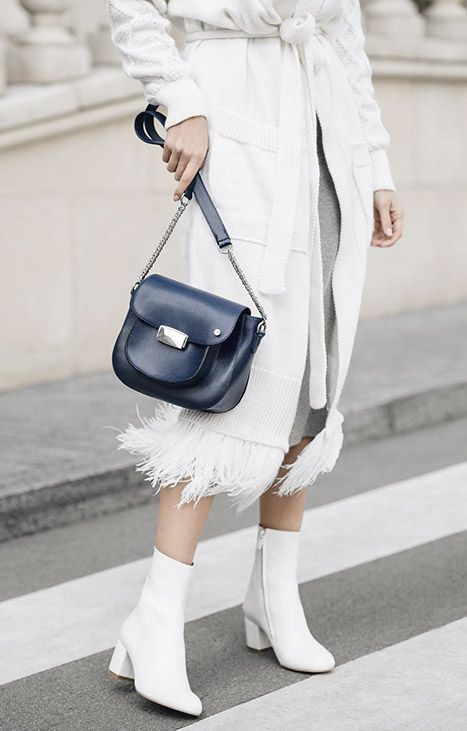 - Если есть каблук, такие боты удлиняют женские ноги . Будем честными, в основном «ноги от ушей» делает как раз каблук. Но белый цвет, пусть и не сливается с кожей, как бежевый, все равно ближе к ее естественному оттенку, чем черный. Это дополнительно придаст роста, если между брюками, юбкой и любой другой одеждой сверху и ботинками есть «просвет» в виде ноги.